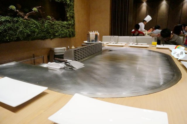 这边的包间都是散座的。铁板台非常的干净。洁净的餐具,面前的调料盘已经倒上了酱油和酱料。 铁板台上的调料真的很多,像冰淇淋球的那个是黄油。