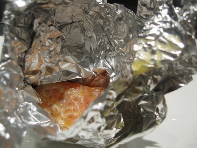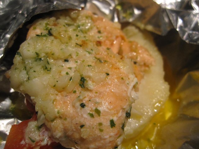 【地中海式锡纸包煎挪威三文鱼尾配番茄土豆】很大的蒜香味,里面的土豆和番茄味道可以忽略,这道菜我反正不太喜欢