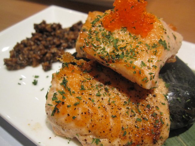 【漫煎挪威三文鱼配香葱香油汁和炒蘑菇】第一次吃煎三文鱼,加上鱼子和调料的搭配,炒蘑菇在外面当搭配,煎的三文鱼鱼肉还是有点老