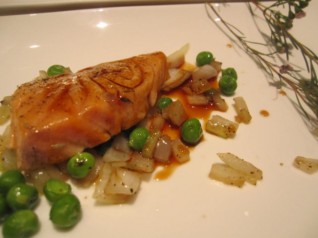 【低温香草油浸挪威三文鱼配春季小炒和烤鳗汁】造型很清新,风格也很独特,喜欢小绿豆炒制,配上洋葱的搭配