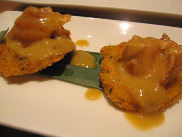 【挪威三文鱼鹅肝卷配龙虾汁】绝对难吃到极点!龙虾汁特别腥味,肯定没处理好,鹅肝也是很生,吃起来腻死