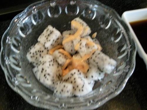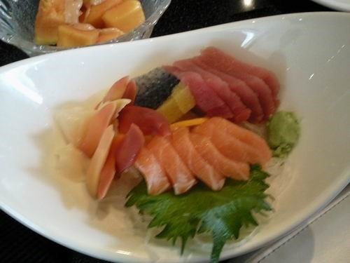 刺身要了三文鱼、金枪鱼、西灵鱼、北极贝、黄金贝,感觉还可以吧,不过感觉三文鱼和金枪鱼吃着不是很香,也可能和酱油有关,似乎是调的酱油~~~