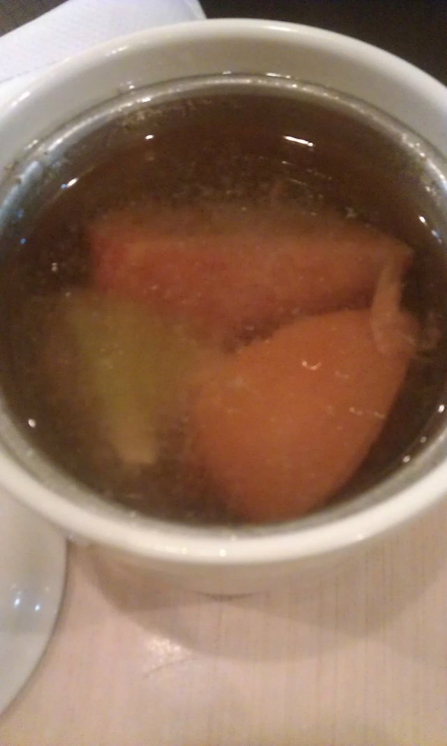 2、酸萝卜老鸭汤:13元,老婆很喜欢,但偏寒,很小的一盅吧,里面就两小块鸭子肉,几块酸萝卜和两块西红柿,汤味道确实不错,也不油腻,很适合孕妇少量饮用。鸭子肉比较入味也不老,酸萝卜也不咸,酸酸很开胃。