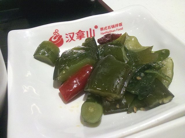 汉拿山石锅拌饭是汉拿山的一道招牌饭,各种鲜嫩的时令蔬菜:豆芽、菠菜、胡萝卜丝、鲜蘑,配一煎蛋、牛肉沫,再拌上热腾腾的米饭和辣酱,地道韩餐美食,素食主义者佳选。