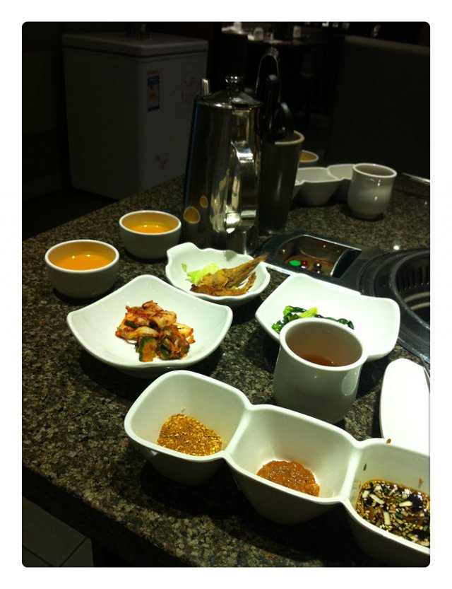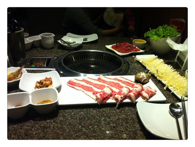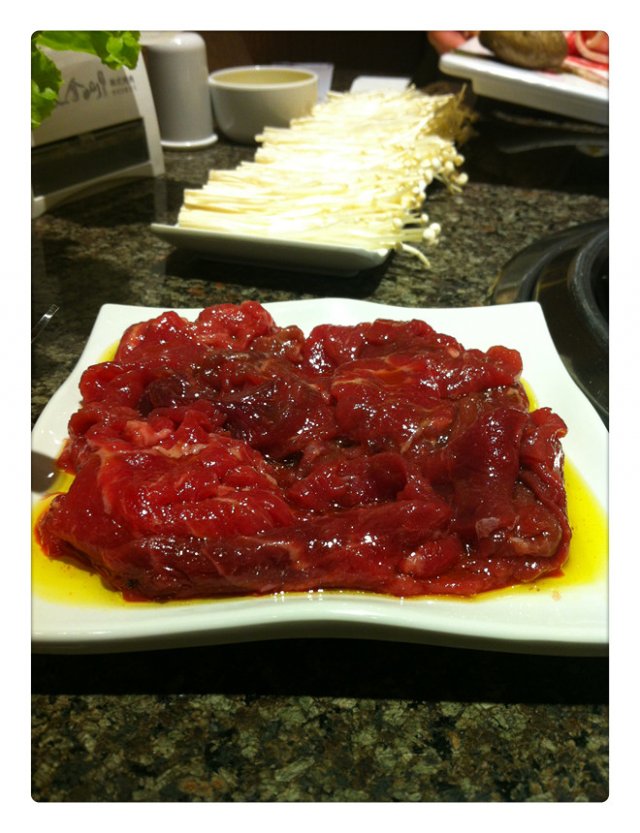 个人很喜欢肥牛,烤牛肉,对于梅肉的话,感觉肉质较厚,不是很适合烧烤;金针菇烤后感觉相当的入味,跟火锅是2种风格,很独特;玉米色拉很普通;石锅拌饭的口感不错,辣的,热的,鸡蛋的,肉的,综合在一起很好吃;南瓜粥很细腻,甜甜的,宝宝很喜欢吃;冰淇淋没有看到,没有问,服务员也没说有没有畅吃;包肉的生菜说是因为2人份,那么给我们一份就足够了,这点不是太满意;