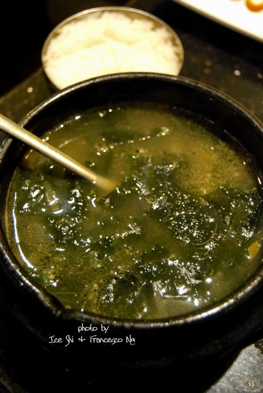 海带汤,这个其实平时自己吃是不会点的,想不到韩国的海带汤如此好喝哦,难怪看那种韩剧里面的人老喜欢喝海带汤,那天算是学习了,以后进韩国料理店,海带汤绝对是选择对象了,这个汤,鲜得不得了,放了胡椒,辣辣的,喝起来特别过瘾。。。