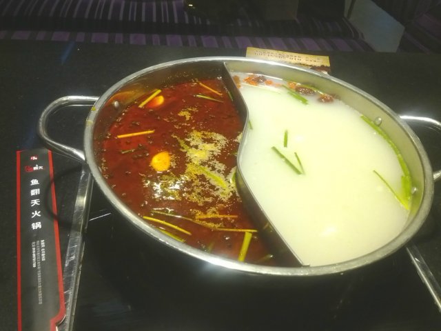 这家店已经变成我们据点了,去过好几次了。店里环境十分舒适,紫色的沙发黑色的桌子,看上去比较典雅大气。吃饭时候每人都有一个小围裙,这是我比较喜欢的一点,经常吃火锅溅到身上特别不爽,双拼的锅子,点的石斑鱼,切成薄片放在一摞小盘子里,涮几下就熟了,味道鲜美,肉质软嫩还没有刺,总之很推荐!