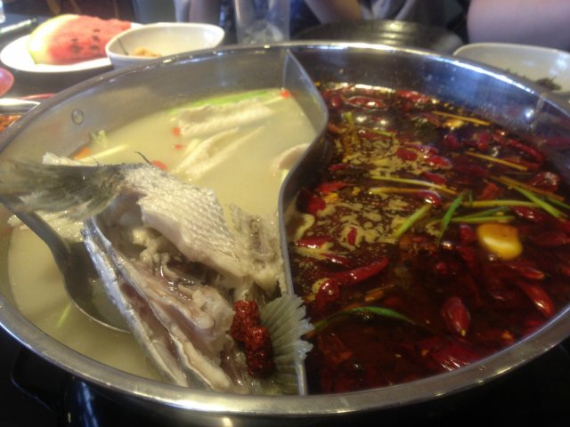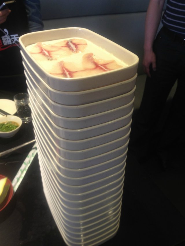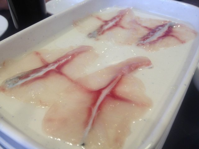 客人点了斑鱼后厨师都会把鱼切片,然后腌制,上盘,上桌,一盘里只有4片,鱼片切的很薄,涮的时间不用太长,鱼皮处有点脆脆的