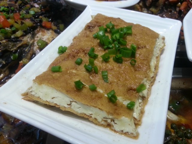 卤水豆腐看着有些像煎的鸡蛋饼,看着很精致,切成一条一条的,撒了些香葱末,看着很引人食欲。豆腐煎的外酥里嫩,外皮泡着卤汁味道很香浓,里面的豆腐软嫩可口,豆香浓郁,很不错的一道小菜。