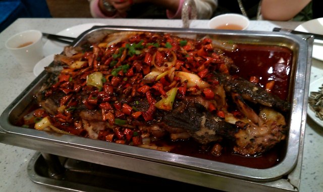 新开的一家,不过照样的大排场龙,本来没想去吃,下午路过想去碰碰运气,正好赶上还有半个小时拿晚上的号,注意哦,是下午一两点就开始排队排晚上的喽!应该是因为价格太实惠了,运气不错,排上了第一批,四点半可以先去点鱼,他们家没什么其他的特色就是烤鱼,四个人建议可以点两条鱼,我们估算的少了就点了一条怪味鲶鱼,有点酸、有点甜、有点辣、反正就是酸甜苦辣都有的非常奇怪的组合,不过吃在嘴巴里尽然也挺好吃的!看看旁边的桌子,基本4个人都是两条鱼,我们哭~~~再加时间又要等很久,大家去吃的时候可以注意喽!
