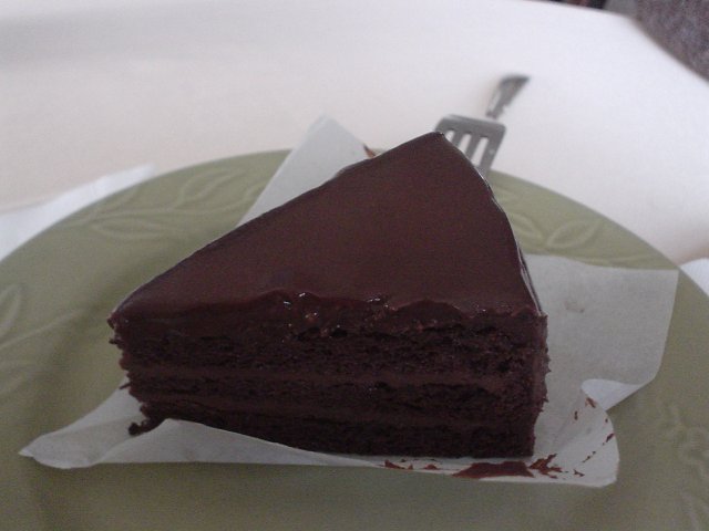 拿着号牌我们找了个位子坐下,旁边沙发座窝着一个MM一个人悠闲地边喝咖啡边上网,一个人的下午真是令人羡慕啊。那块巧克力蛋糕上来了,小小的一块,味道满浓郁厄,还算不错,不是太甜,但没能带给我太惊喜的感觉。我的热巧克力装在普通的咖啡杯里,据说这个热巧克力里还配有奶油和棉花糖,味道就是蛮普通的热巧克力,要用小勺不断搅拌,喝到最后杯底还有沉淀。
