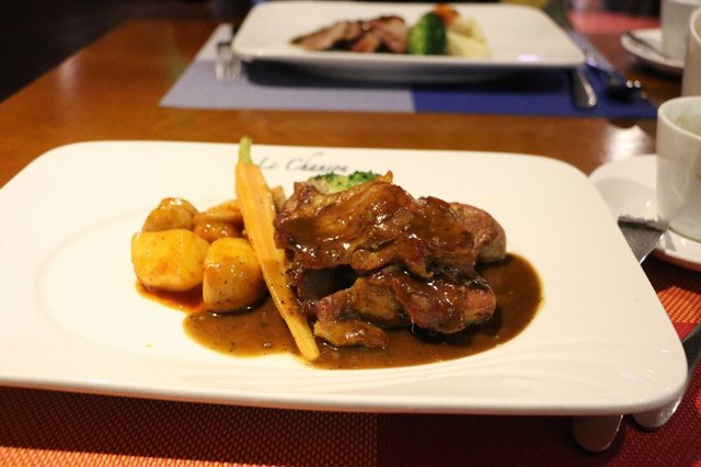 香煎黑胡椒鸭胸,也是法餐的特色菜,鸭胸感觉是有点熏味的,但不至于特别浓。肉质比较硬实,耐嚼。土豆泥一般,没有奶香味。