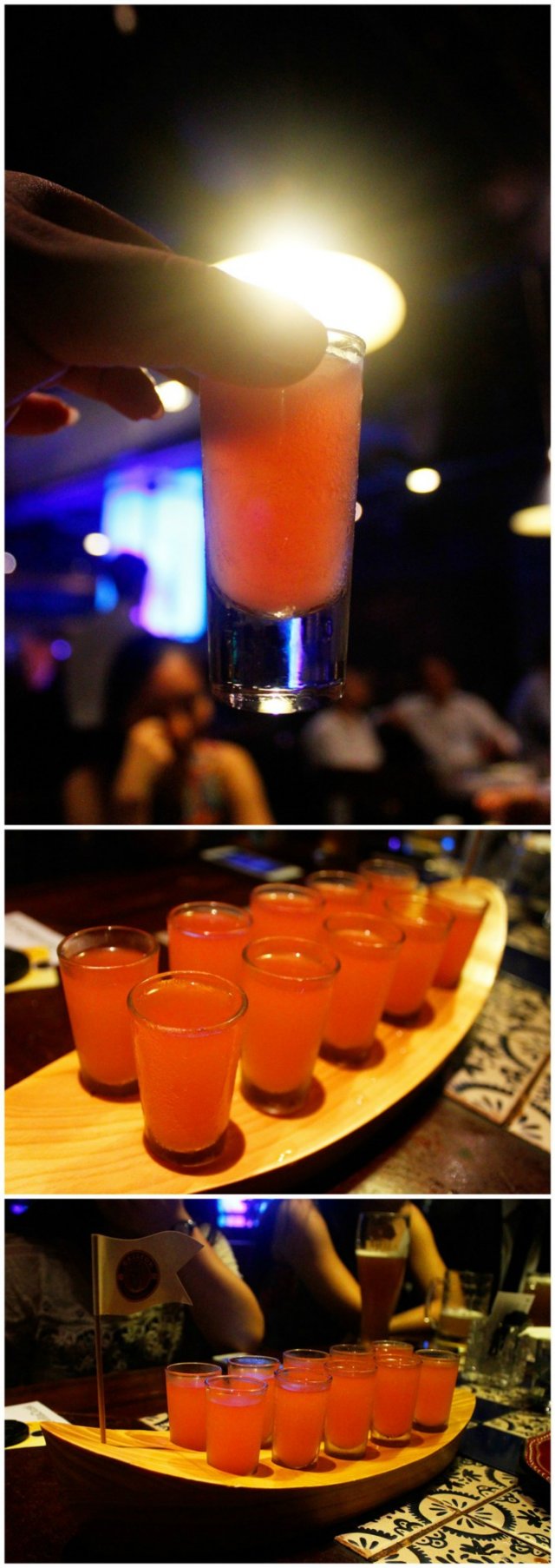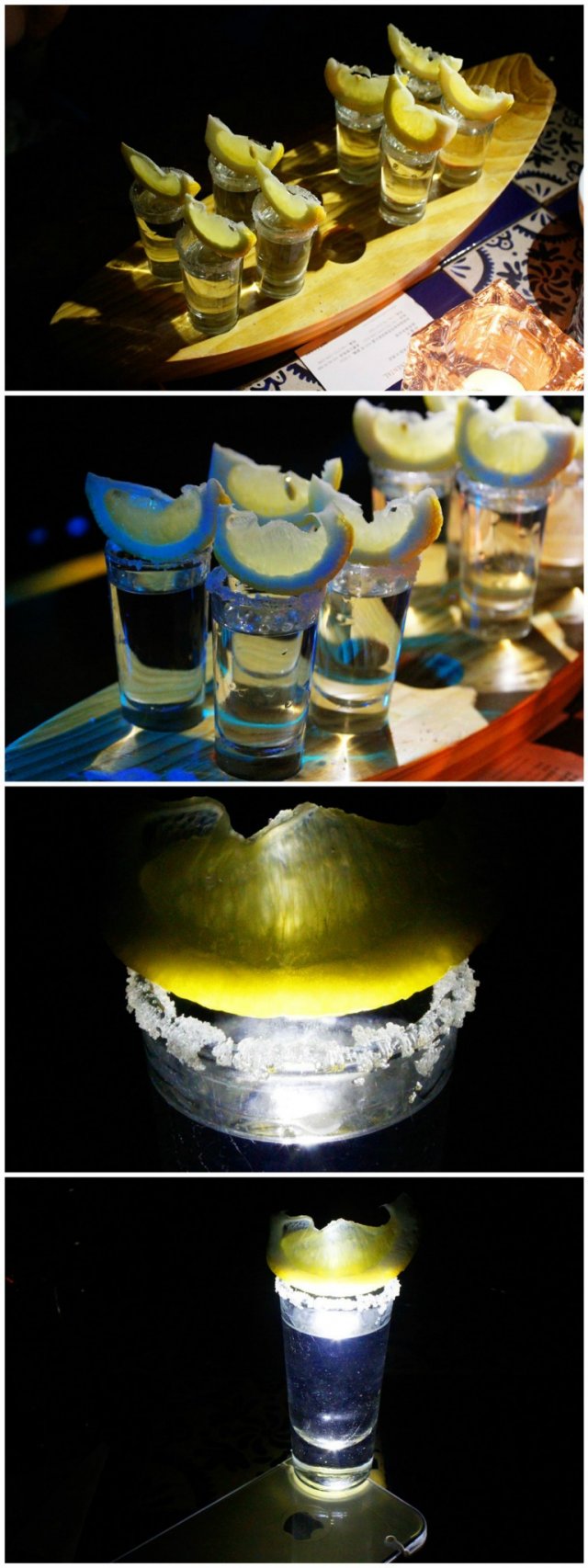这杯应该是纯龙舌兰,杯口配有一圈盐和一片柠檬片。