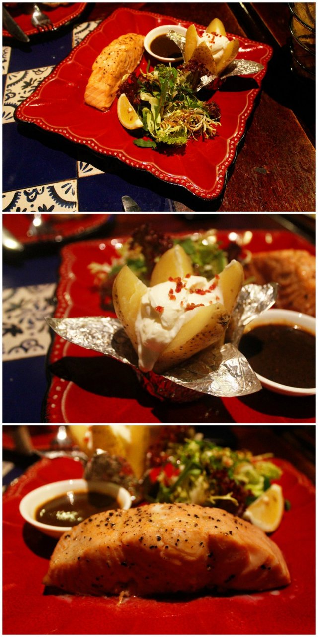 稍微煎过的三文鱼块近闻蛮香,形状也好,很厚,上面撒着黑椒末很诱人。