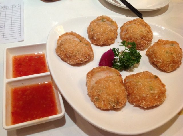 【越南烧虾饼】49元:名字上有越南的我一般都不爱点,之前有对越南菜不好的印象,但是某人给点了,就吃吧,饼被切成两半,能清楚看到虾肉,沾上一点搭配的酱料,口味酸酸甜甜的很开胃,我觉得这个菜自己也可以尝试着做,有空研究下。