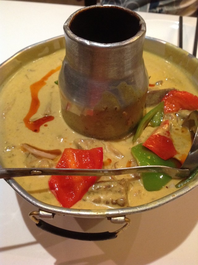 【大马咖喱牛腩】56元:每次去泰国餐厅,咖喱是必不可少的,浓郁的咖喱里放入的是土豆和牛腩,土豆煮的时间长以后是酥酥的,牛腩很嫩,为了多吃点其他的菜,并没有点米饭,其实拌饭更好吃呢。