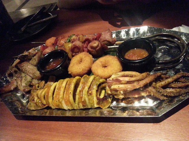 海陆大汇串(148元):性价比不高,上来的时候都是温的,有鱿鱼、猪颈肉、虾饼、培根串,味道很普通。