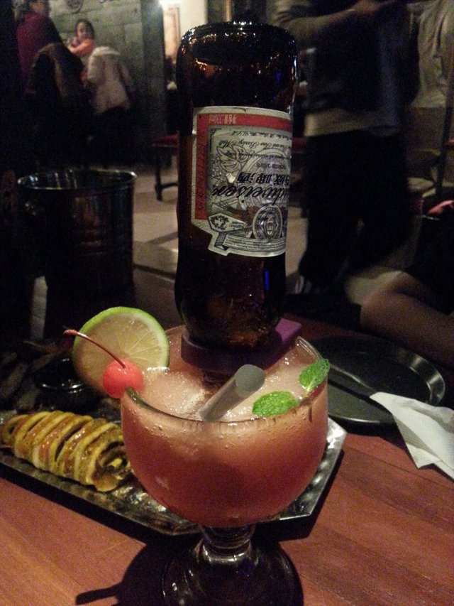 海盗的锤子(78元):选择了西柚味的,其实就是百威+西柚冰沙,造型好看,味道还行,比较适合女生喝。