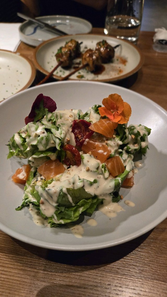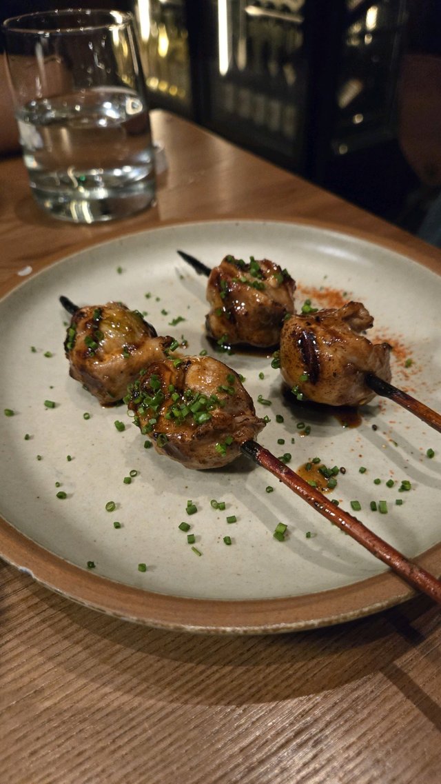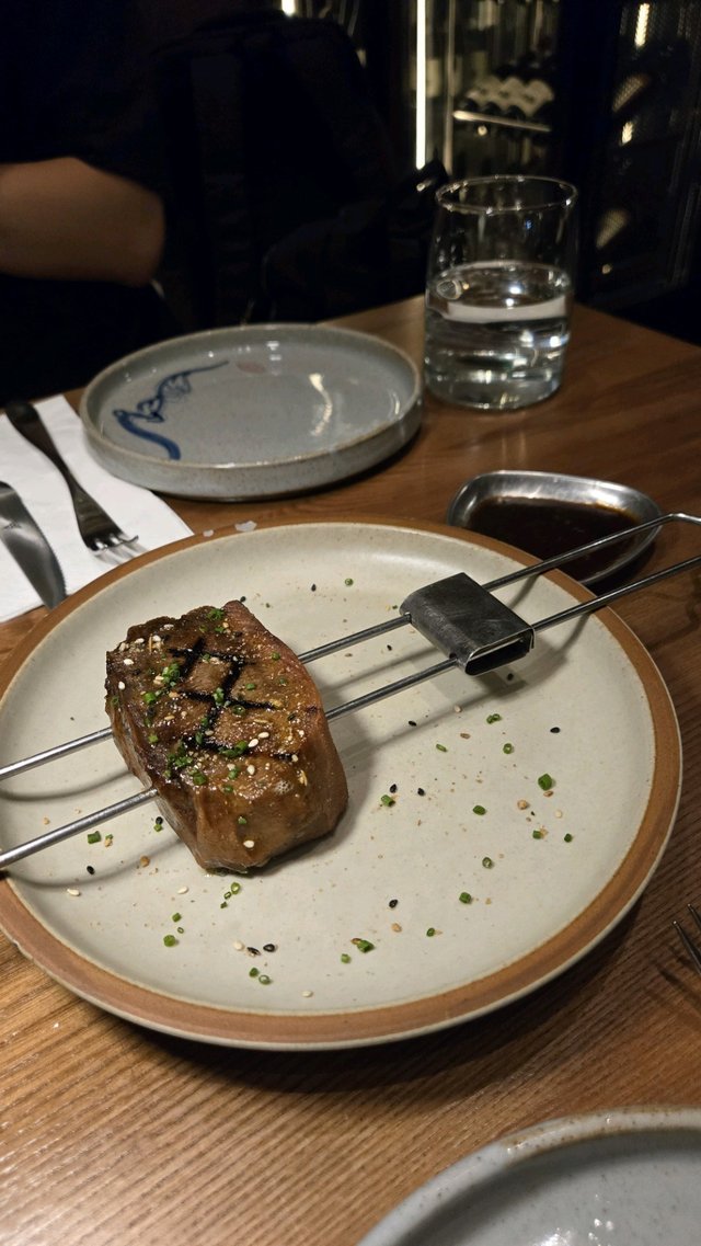 店內環境高雅美觀,氣氛感十足!服務非常周到,會先詢問客人是否需要拍照,再 處理或分配食物,非常貼心!菜品精緻又美味,大推!厚切牛舌肉質細嫩有口感,牛舌味香濃,配上甜醬好好吃!串燒肉內 釀青堤,青甜青提減低膩感,新鮮組合但效果意外地好。牛小排 juicy 又牛香濃郁,放熱盤呈上充分保留熱度和美味! 還有鵝肝飯超香超邪惡!最後連甜品亦水準十足,上層脆下層濕軟,咖啡、朱古力、酒味,三味鼎立且相互協調,幸福感十足!