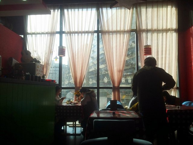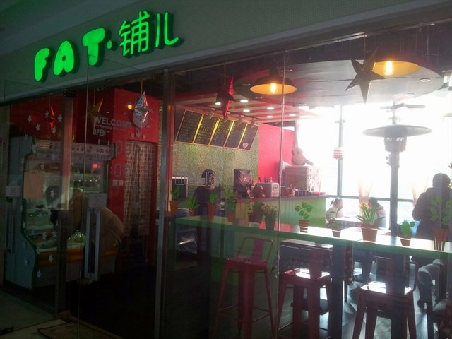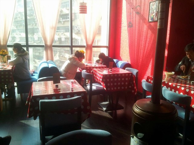 第二家被我“雷达”搜寻到的便是位于新天地大厦三楼的FAT铺儿。店内面积依然是很小,但环境很温馨、可爱。由于大厦里面温度有点低,导致大厦内的所有店铺都跟着遭连累。但午后阳光充足,靠窗的位置有通透的落地窗,很明亮温暖,但来晚了都被其他客人占领了。吊顶是巨大的美国队长的盾牌,仿佛被美国队长罩着!墙上的色调也是大胆强烈,装饰画童趣盎然,红色波点的桌布火热耀眼。