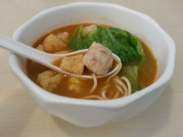 一共四个花枝丸,很有弹性,不过有着速冻食品的那种甜味。