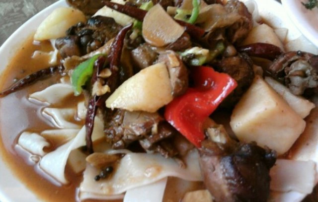 大盘鸡(小份40元)最后才上来的,鸡肉,土豆和面条,没看到面筋啊,味道微辣,都是一大块一大块的,做工比较粗糙,味道还行。