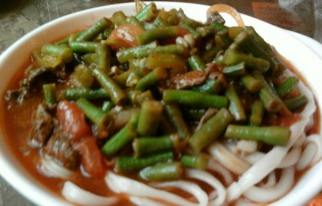 拉条子(小份8元)还是西红柿和豆角的配料,变成的面条,还有些微辣,真是没创意,不好吃。