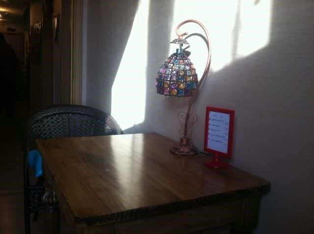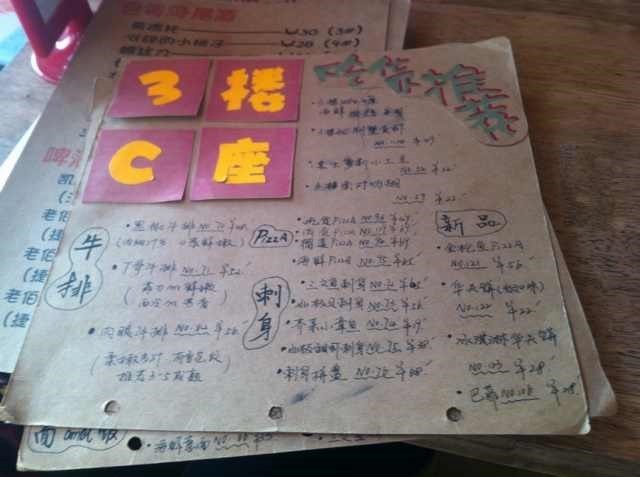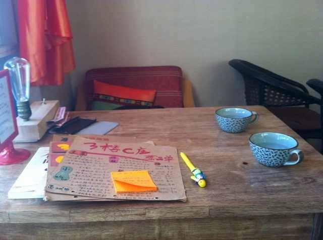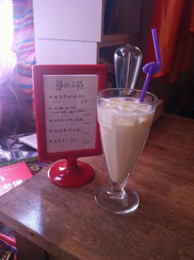 环境:很像在家吃饭!装修的非常舒服,令人感觉宾至如归,分两个屋子,一间橘色另一间蓝色!飘窗有书架,可以自行取悦,属于那种比较有内涵的书籍!音乐放的比较伤感~每个餐桌上都有一个不同类型的台灯,墙面挂的大象涂鸦!从店内摆设到餐具菜单这些小物的款式真是令人爱不释手,非常有情调,看得出老板是用了心思在里面的。只是餐桌不多,去晚了只能在楼道等位。