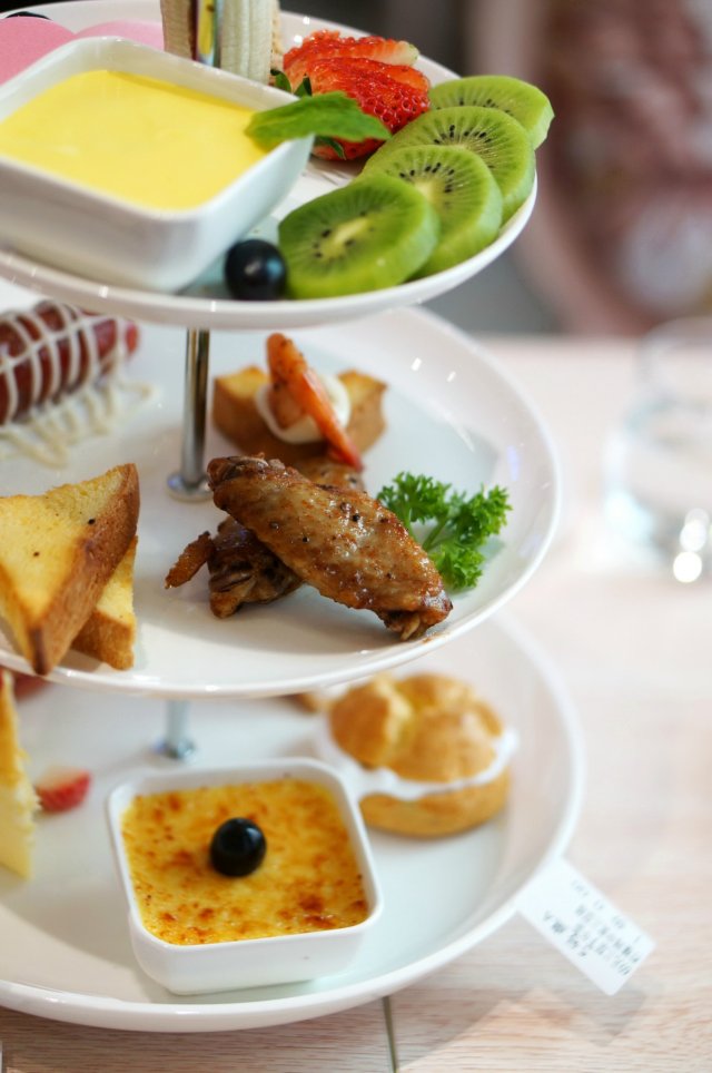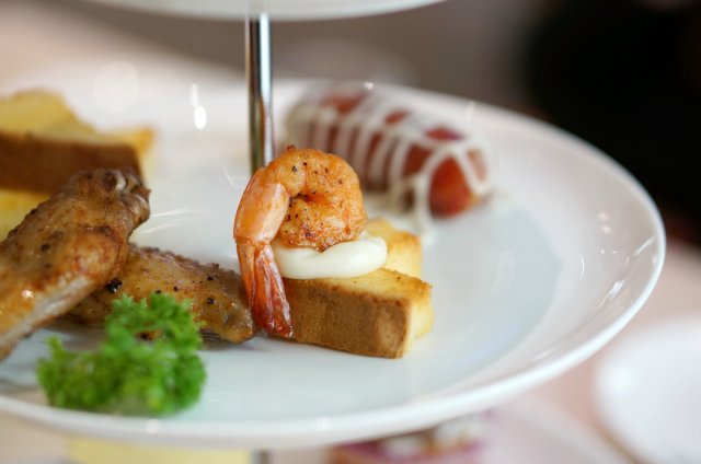 有烤鸡翅、黄油面包片、煎虾面包片和一根台湾香肠,