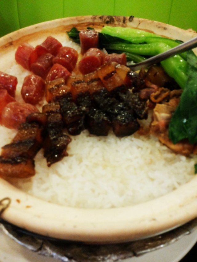 经典腊肠煲仔饭(48元)xxl的,够4个人每人吃2碗的感觉,量很多,味道要放上酱油才行,我总感觉像酱油炒饭,腊肉微微咸。