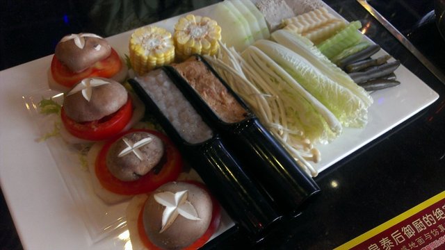 坐下后,报了套餐,服务员很快的端上了海鲜套餐和蔬菜的拼盘,摆盘上来看,我觉得比较细致哈,卖相不错