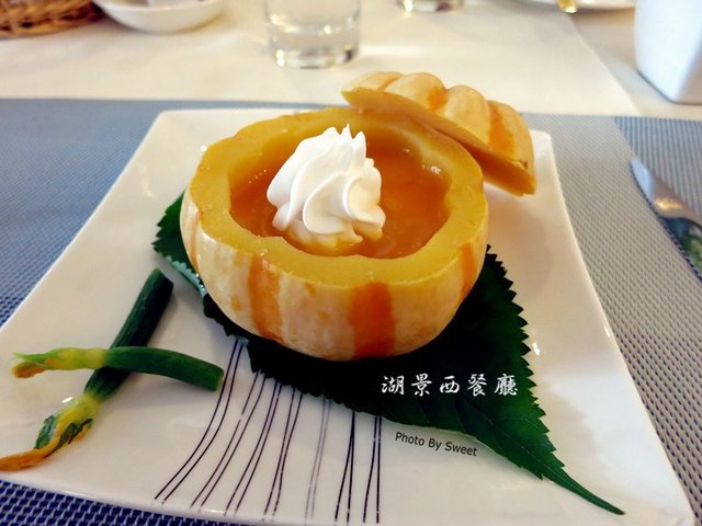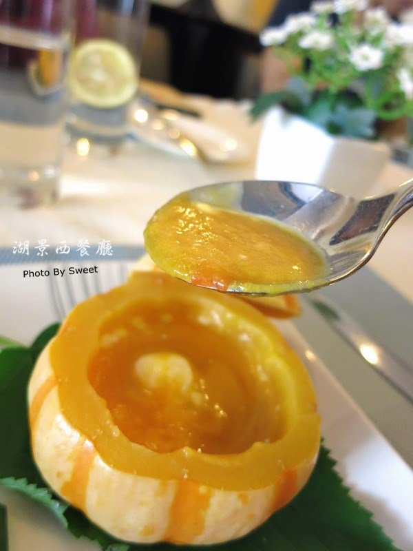 南瓜汤,这是我第一次见用小南瓜盅盛的南瓜汤,虽然小,但内涵丰富,有各式海鲜粒,让香甜的南瓜汤更多了一丝鲜甜。