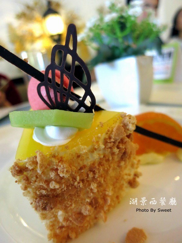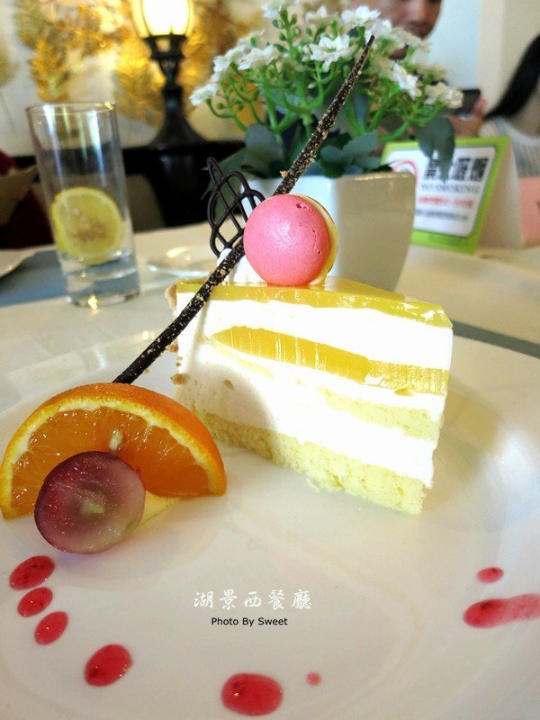 甜品是香橙慕斯,有香橙的味道,但对于我来说还是偏甜了,虽然是慕斯,但奶油过多,有点腻哦~上面的杏仁小圆饼(为什么不说是马卡龙?因为他没有马卡龙特有的裙边)还是很有杏仁味道的。