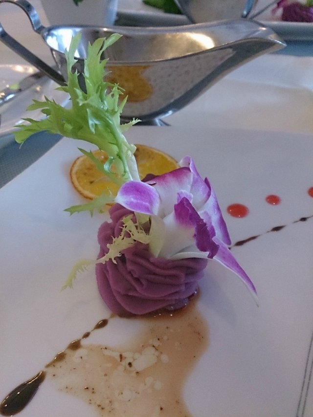 终于迎来今天试吃的主食,选的是7分熟,配黑椒汁,汁可以自行选择放与不放。摆盘装饰用的花下面是紫薯泥,较少见,牛排交叉排列,整道菜品立体感强。即使是7分熟牛肉嚼劲足,听主厨说这是因为餐厅坚持不腌制牛肉直接烹制的原因。我到觉得这样也挺好,因为好的牛肉本身肉质就很鲜美,少去了调料腌制进入的口味能更大还原牛肉的本身味道。在一边细细咀嚼的过程一边感受牛排的鲜美也是一个特色。