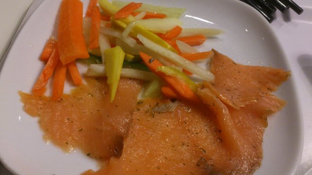 很喜欢三文鱼,正好也打折,又来了份香草烟熏三文鱼,味道刚刚好,淡淡的烟熏味道,鱼制很嫩。