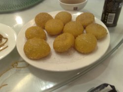 这个金黄色的饼忘了叫什么了,嘿嘿...光顾着吃了。糯米南瓜做的,表面一层芝麻粒。吃起来很筋道,还配了一小碗沾的奶油,很好吃。