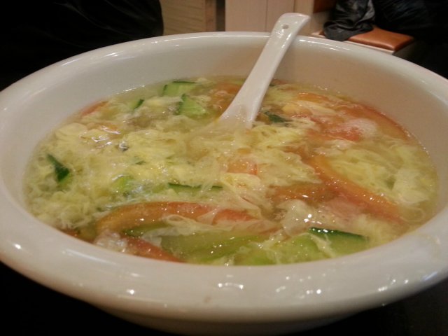 番茄蛋花汤分量很大,红红黄黄的,颜色很漂亮,里面还加了黄瓜片,味道清爽,口感清脆。酸酸甜甜的汤汁带着一丝黄瓜的清香的味道,喝着很是爽口。