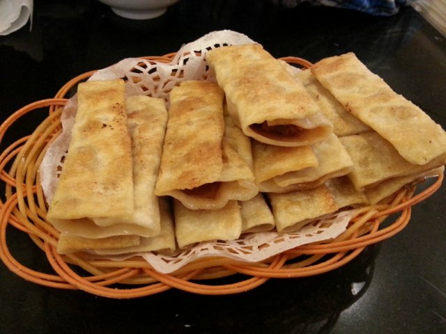 家常葱花饼的味道很香,分切长了8块,装在小筐里。