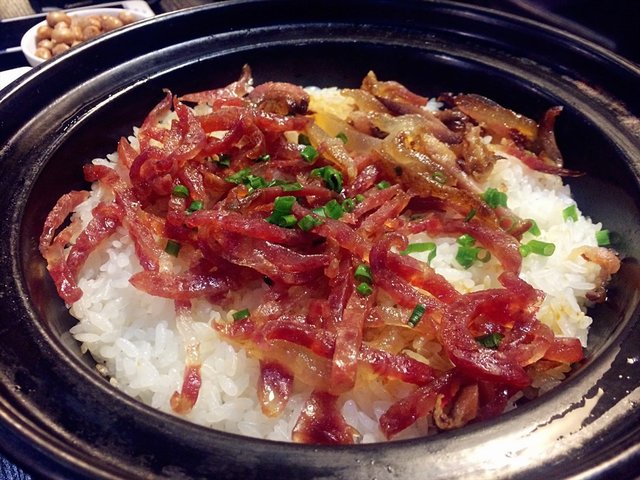 广式腊味煲仔饭,49米。貌似是最近吃过的分量最足的饭了,一大盆上来铿锵有力啊。腊肉和腊肠被切成细丝,容易入口,和干香油润的米饭一起搅拌均匀就可以食用啦。腊味都有点重口味,配饭吃还可以接受,单吃米饭也有淡淡的肉香,默默点赞。