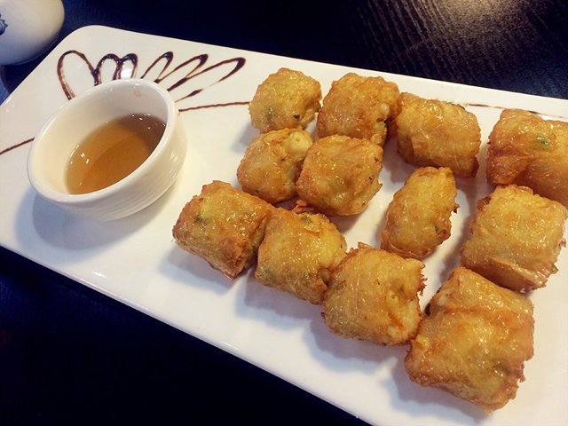干炸响铃,38米。上菜超级快,估计是提前准备好的材料,下锅过油就上桌了。豆皮裹着荸荠和虾仁,配着酸甜口儿的金桔油,很解腻,味道特别,咸鲜口儿很有爱咩。外婆家神马的都弱爆了好吧。