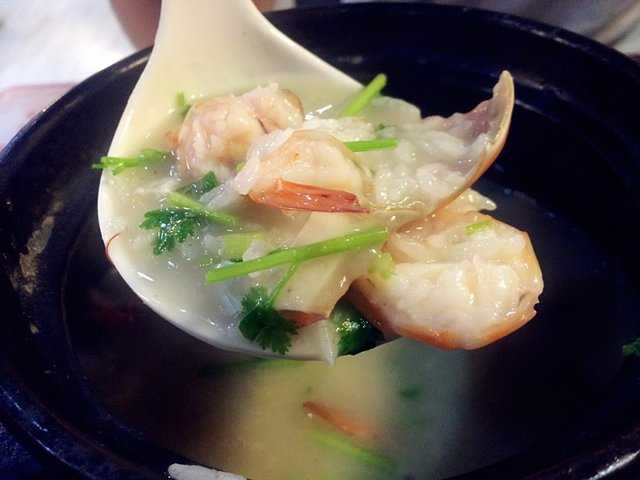 招牌干贝虾蟹粥,小份69米。虽然是海鲜料,但熬出的却是很浓稠的粥体,长米粒神马的看起来总是觉得比普通白米要好吃。虾是被剖开的,蟹应该有一只,食材很新鲜,放了姜片和香菜调味,很清淡。