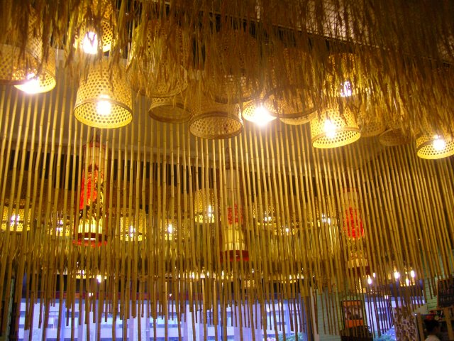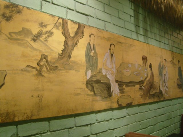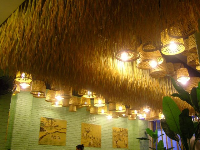 他家的装修最大的特色就是倒挂在强顶上的那些稻穗了,而灯饰就用该是那些用来装稻穗的箩筐了,奇怪的是这些装饰并没有显得很入乡,而是带有着那么一点点另类的时尚感。墙壁上挂着的,是描述着大米从种植到收割再到被熬制成粥的过程的木版绘画。