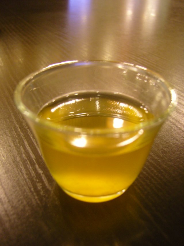 落座点了他家的世博粥,潮式干鱿鱼鲜虾干贝粥,据说这道粥是入选了韩国丽水世博会的菜式。然后就有店员送来了润喉的柠檬茶,加入了蜂蜜的柠檬茶清甜可口,只是用来装茶的杯子太小了。