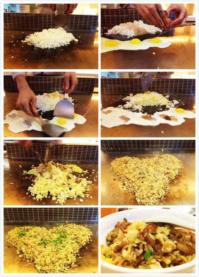 这道菜就是传说神马的会跳舞的炒饭,师傅的厨艺好高超,看得我们都目不转睛,饭炒得粒粒自然分开,每粒饭的外层都被一层薄薄的蛋黄包围着,真的好香,里面还有牛肉。不得不称赞师傅很有爱,竟然把这饭炒成一个大大的心型,请大家掌声鼓励。
