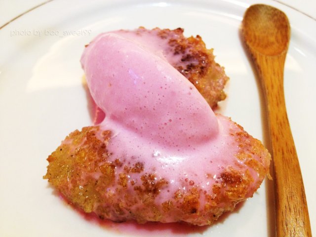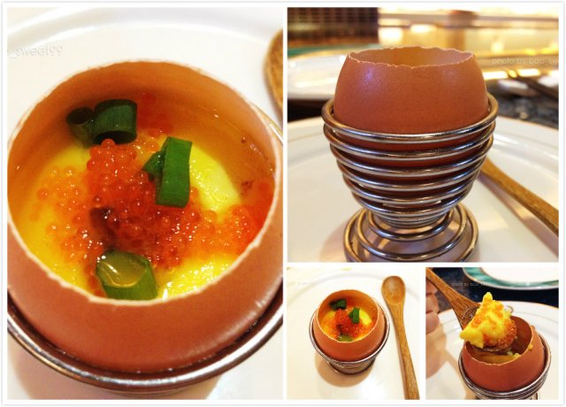 这道菜的烹调过程有点繁琐,首先是纯蛋黄蒸一会,然后在蛋黄半熟的状态下放入鹅肝继续蒸,接着在放入鱼子和葱花继续蒸。