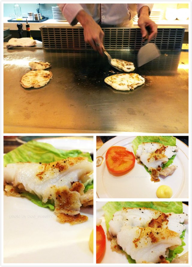 这是来自冰岛的鳕鱼,铁板烧做法,师傅把这鳕鱼煎得好香丫。鳕鱼沾点柳橙酱,一点都不觉得油腻,而且有淡淡的橙子香味。但是吃完这鳕鱼后,在吃番茄,口腔感到好腥味,建议改良这道菜,可以把番茄换成土豆,或者别的蔬菜。
