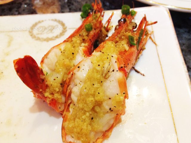 今天的最后一道菜----开背蒜蓉虾,用的是九节虾,师傅的烹调方法是:先用大量的牛油炒蒜蓉,把虾煎到半熟,然后在虾背上放上牛油蒜蓉,接着在滴柠檬汁,在洒葱花和黑椒粒就完成了,超级美味,但是蒜蓉味比较浓,是一道很香的重口味菜。