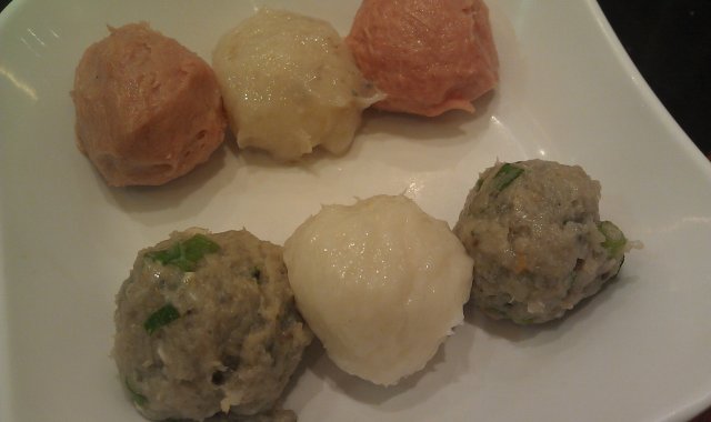 四宝丸是虾丸,牛肉丸,猪肉丸和贡丸。都是新鲜打出来的,所以颜色比较新鲜,质感Q弹,而且有肉鲜味;