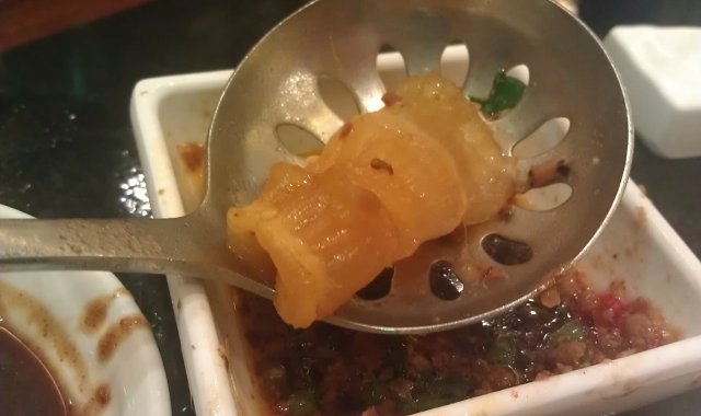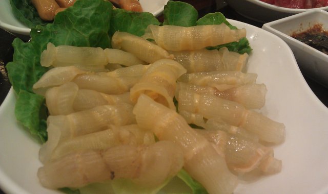 斑鱼片,很大一片,涮5-6下马上熟了,很弹牙的肉,没有鱼腥味道,好吃;