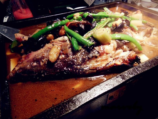 点的是黑椒蚝油味道的,端上来的烤鱼,汤汁上看的出撒了不少的黑椒,所以味道要比菜单上标的一个辣椒的辣度感觉高一些。蚝油在汤汁里融合之后,已经没有了原本的浓稠,浓郁的味道也减淡了很多,但仍旧保留了清香的口感。鱼钩是产自钱塘江的一种鱼类,平时在其他烤鱼店不太容易吃到。鱼肉完全没刺的,鱼肉呈月牙瓣,很容易入味。配菜选择的是千叶豆腐和魔芋,同样很少有烤鱼店会用千叶豆腐来做配菜,它的Q弹幼滑的口感自然无语多言。魔芋是块状的,虽然切块的魔芋比魔芋丝要贵一些,倒是我个人还是比较喜欢魔芋丝啊。